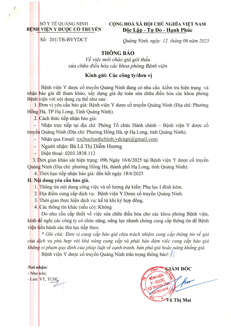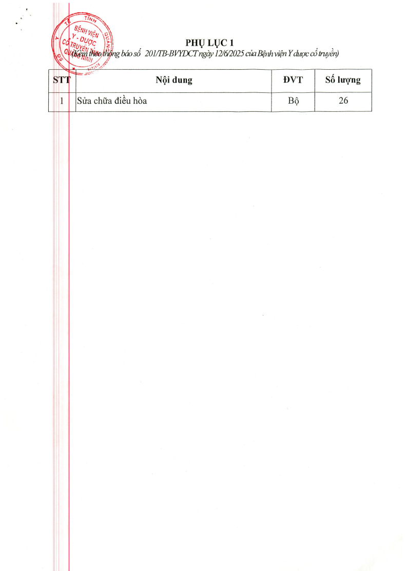 V/v mời chào giá gói thầu : Sửa chữa điều hòa các khoa phòng Bệnh viện