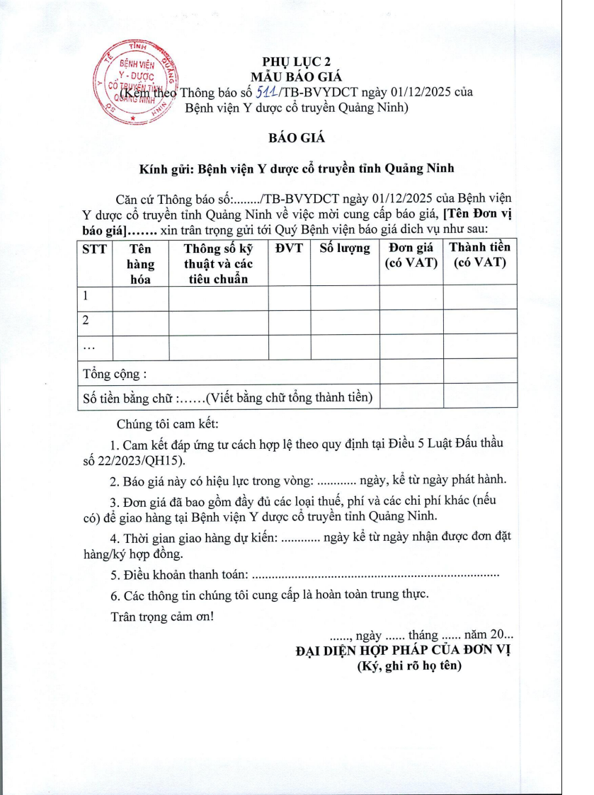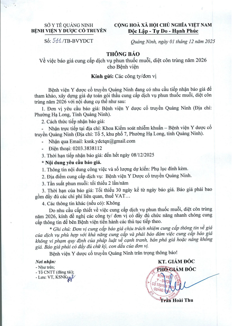 V/v cung cấp dịch vụ phun muỗi, diệt côn trùng năm 2026 cho Bệnh viện