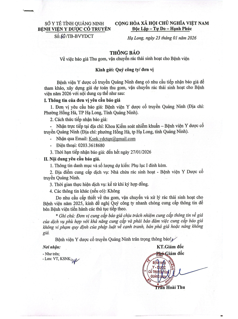 V/v dự toán thu gom, vận chuyển rác thải sinh hoạt cho Bệnh viện