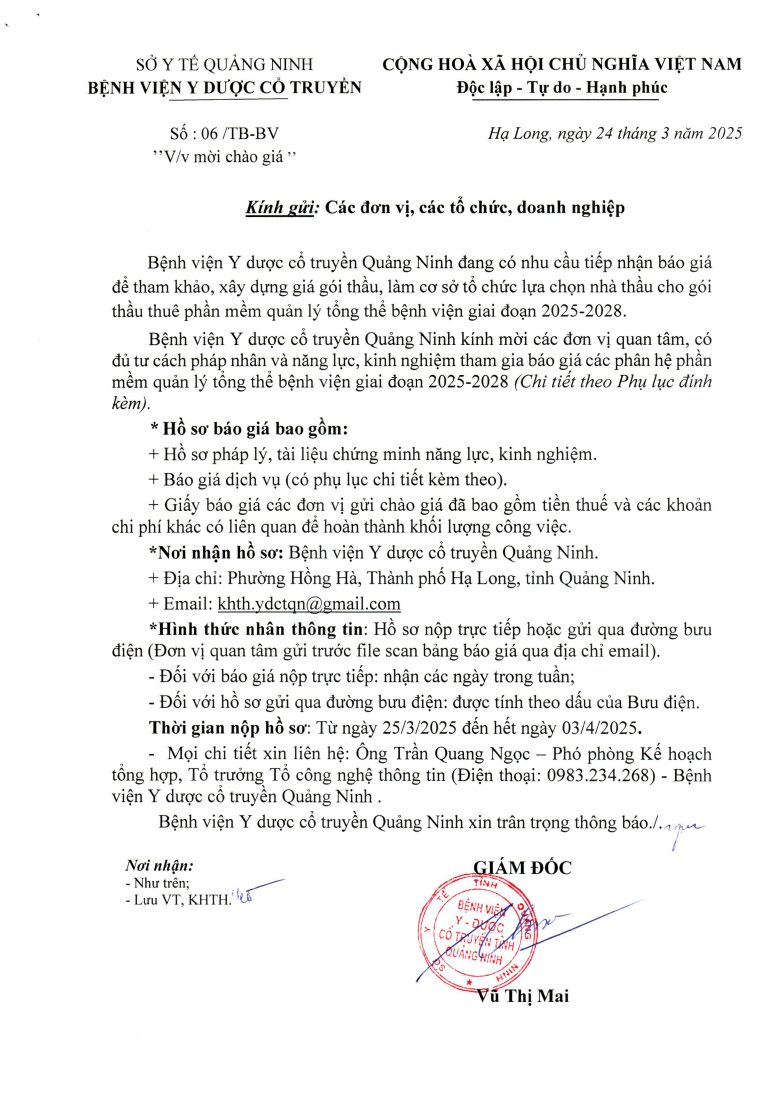 V/v chào giá gói thầu thuê phần mềm quản lý tổng thể bệnh viện giai đoạn 2025-2028