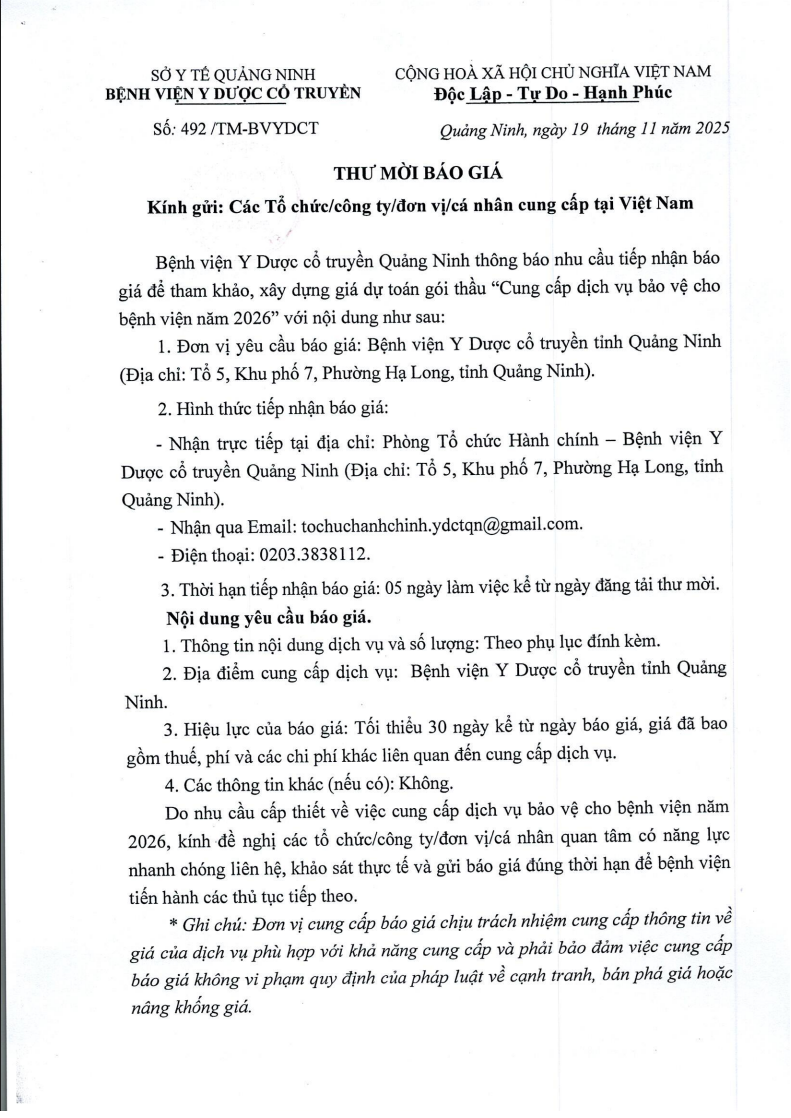 V/v Cung cấp dịch vụ bảo vệ cho Bệnh viện năm 2026