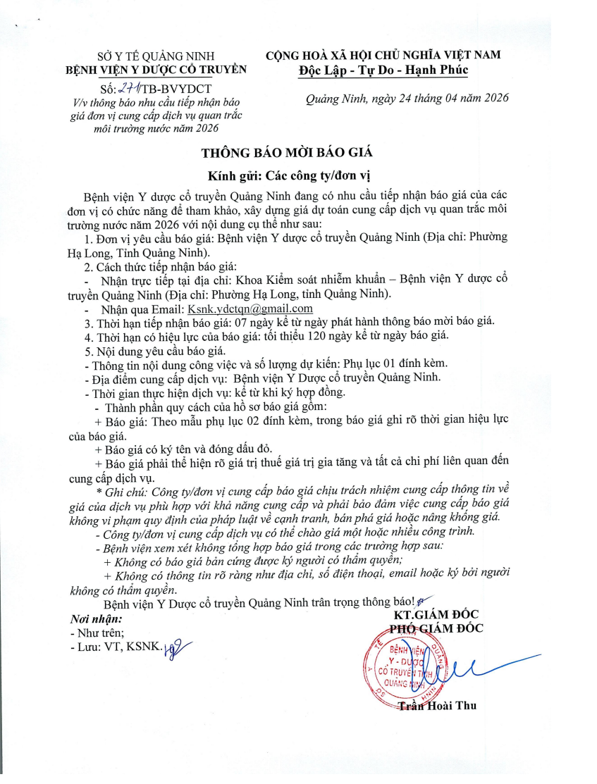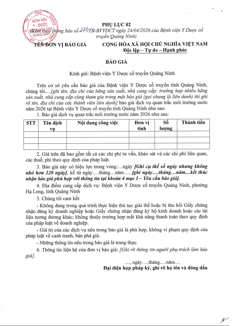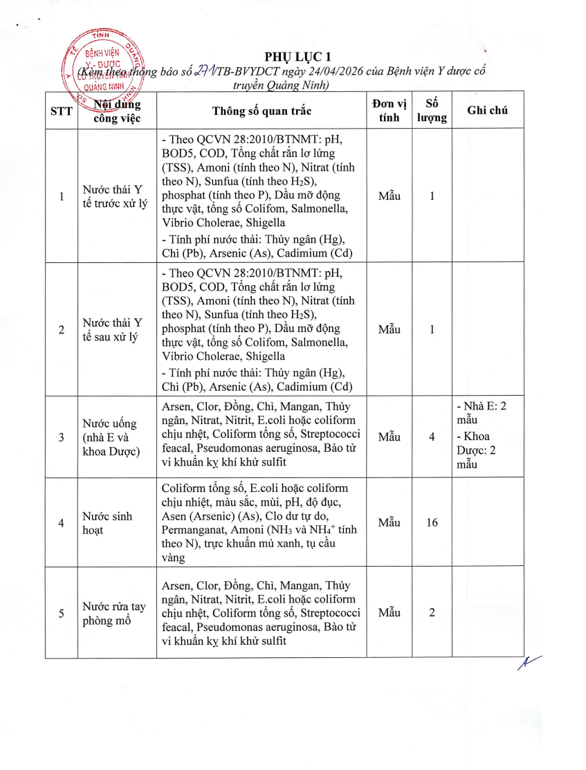 V/v thông báo nhu cầu tiếp nhận báo giá đơn vị cung cấp dịch vụ quan trắc môi trường nước năm 2026