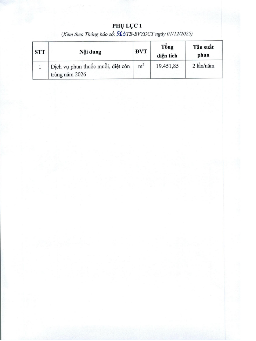 V/v cung cấp dịch vụ phun muỗi, diệt côn trùng năm 2026 cho Bệnh viện